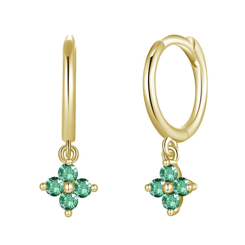 Small Clover Dangle Hoop Earrings with Flower Shaped for Women, 14K Real Gold Plated Drop Huggie Earring with Green Cubic Zirconia Charm in Sterling Silver Gifts for Her