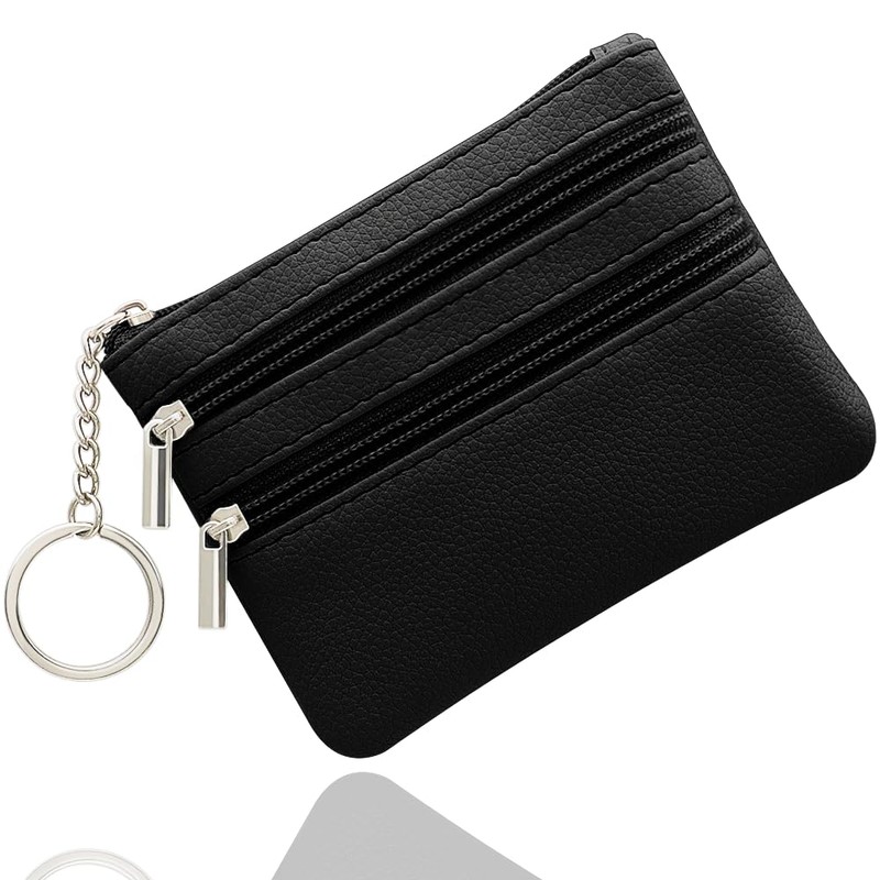 Small Coin Purse, Leather Wallet, Credit Card Purse with Three compartments, Zipper, Key Ring, Small Purse, Business Card, Mini Wallet for Women, Black, (N1-DWXG-B11E)