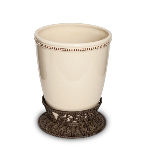 - Smooth cream ceramic holds everything from hand towels to trash in this wastebasket with metal holder and a capacity of 332 oz
