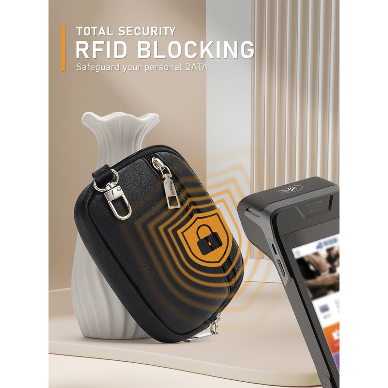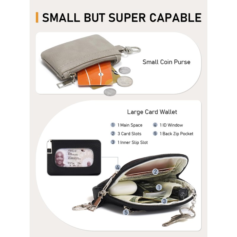 - Keychain Wristlet Wallet With RFID Blocking Function: This RFID dual pouch wristlet wallets for women features special RFID lining in the card slots and small coin purse, which can effectively prevent your lD card and bank card from getting scanned and stolen. Keychain wallet RFID blocking engineered specifically to block 13.56 MHz or higher RFID signals