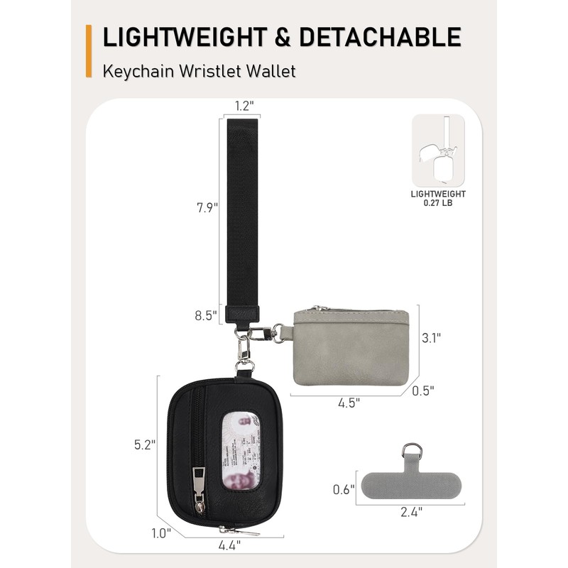 - Detachable Womens Wristlet Wallets:The dimensions of the large card wallet is 5.2" (L) x 1.0" (W) x 4.4"(H) for the small coin purse 4.5" (L) x 0.5" (W) x 3.1"(H), the wrist strap measures 7.9 inches in length. No matter where you go, you can easily carry this dual wristlet pouch with you. Mini coin purse keychain add more fashionable elements to your look