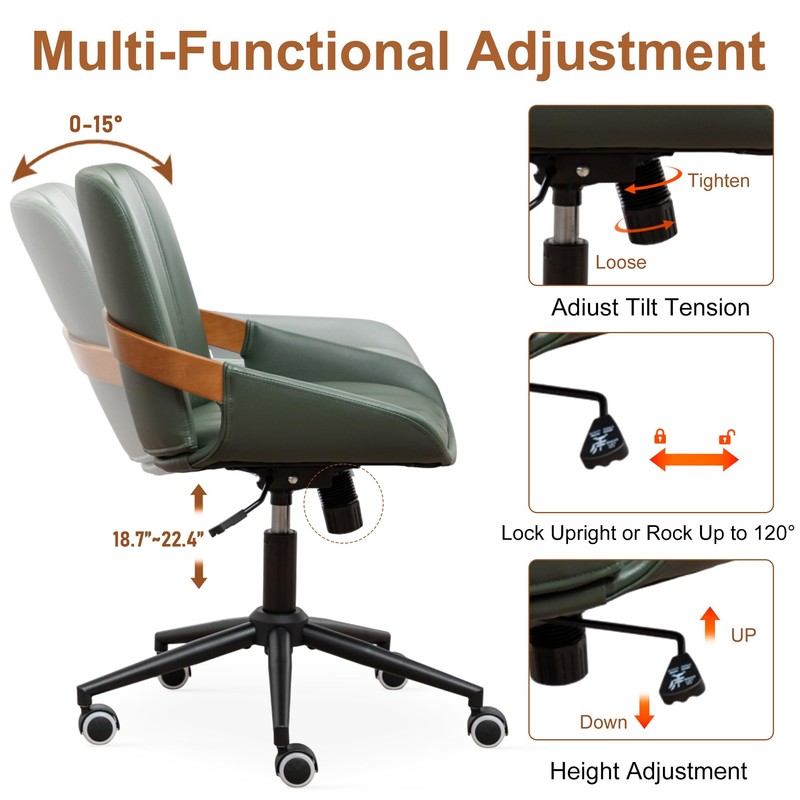 This comfortable office chair incorporates a medieval striped pattern and is upholstered in smooth artificial leather, making it an ideal choice for home offices, studies, or bedrooms. The office desk chair offers adjustable seat height (18.7–22.4 inches), a swing range of 105° to 120°, and a tension-adjustable tilting mechanism controlled via a knob for personalized comfort. Its ergonomic armless design, complemented by high-density sponge cushioning, ensures both comfort and efficient use of space. Equipped with five silent casters, the rolling desk chair allows for 360° smooth mobility while protecting various floor types, including wooden surfaces. The package includes installation tools, illustrated instructions, and access to video guidance, ensuring hassle-free assembly.
