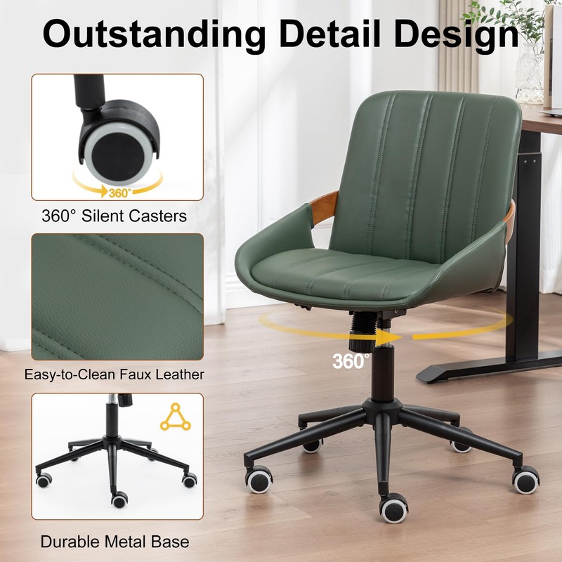 Small Home Office Chair No Arms,PU Leather Desk Chair with Wheels,Adjustable Height Work Chair,360° Swivel Computer Desk Chair for Office, Reading and Study (Green)