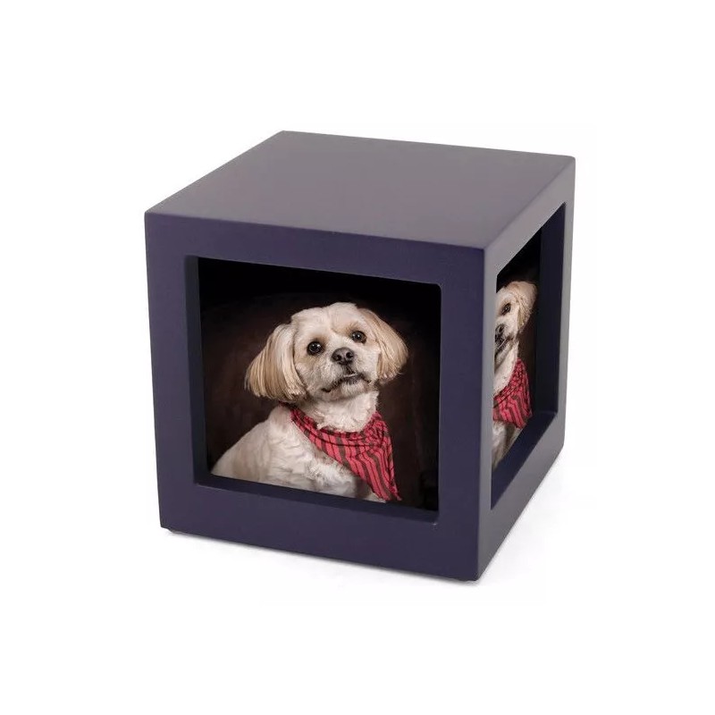 The Violet Photo Cube accommodates three pictures and has a separate cremation compartment. The finish is a beautiful shimmery purple. This piece holds a 3.68 x 3.5 inch photo.