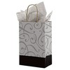 These Platinum bags feature a complex Platinum design and solid black bottom to polish off the look. Pair these bags up with our coordinating packaging options such as our tissue paper, ribbons, or bows and transform ordinary paper shoppers into elegant, classy gift bags. Your customers will love carrying out their purchases in our Black & Silver Swirl Paper Shopper. Sold in cases of 100. 5 ¼” x 3 ¼” x 8 ¾” (Rose), Kraft Interior Color, 100% Recyclable, Tissue Paper Sold Separately, 85-92586