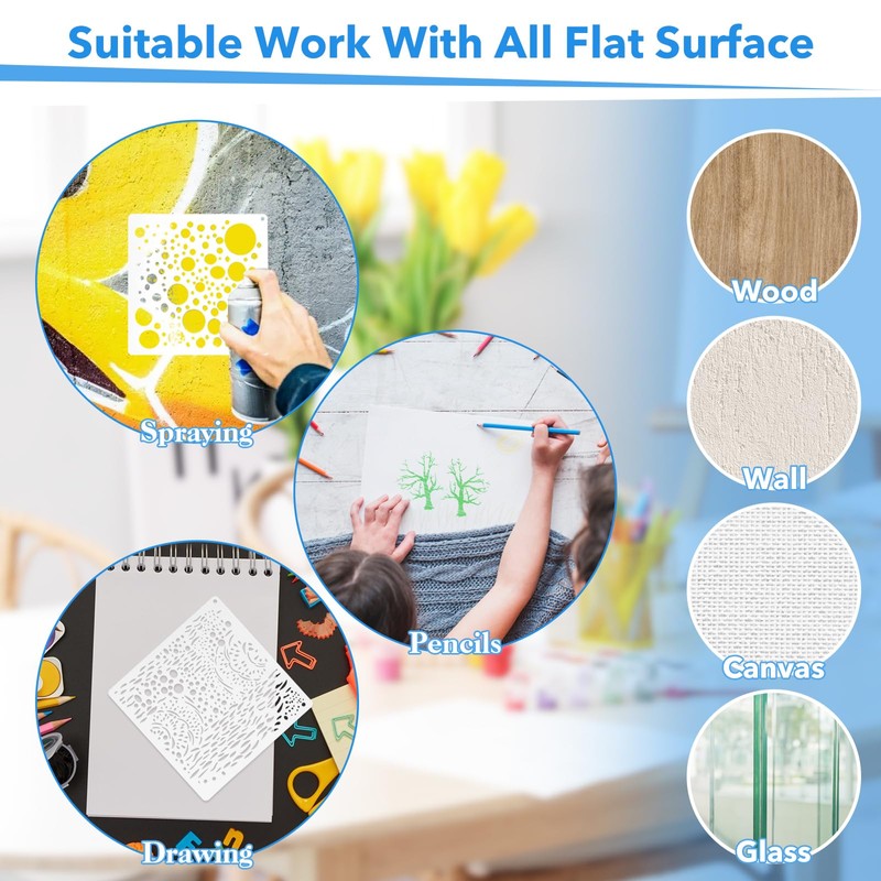 - 【Easy to Use】The stencils for crafts reusable is translucent for easy alignment and placement. Just use temporary adhesive to hold it in place and paint,it’s suitable for tracing, painting, or spray painting, these reusable wall stencils allow adults to layer and mix paintings to inspire creativity and imagination and share your DIY art projects