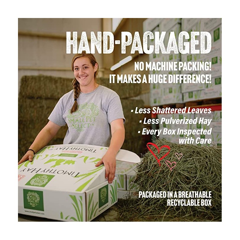 Small Pet Select timothy hay rabbit, guinea pig, & chinchilla pet food. your rabbit, guinea pig, or chinchilla is going to love Our hay! Guarantee! just ask around you'll find that small pets truly enjoy this hay. Small Pet Select searches long and hard specifically for the highest quality timothy hay for rabbits, guinea pigs, and chinchillas in the world and deliver it fresh to your door.this hay is hand selected using only the very best quality with rabbits, guinea pigs, and chinchillas. It is then hand packaged into a high strength corrugated box in very small batches, and the quality is re-checked as the item ships. this process ensures the very highest quality hay arrives At your door Each and every time. The end result is a hay product that is beautifully green, soft, sweet tasting, and so fragrant you can practically smell the meadows. it's what our pets would pick for themselves if they could. ✓ The highest quality - Premium timothy hay for rabbits, guinea pigs, and chinchillas. ✓ by & For small Animal Owners - We're passionate about our pets, so we hand- select & package in small batches as only pet-lovers would do. ✓ delivered fresh & minimally handled - Direct to your door in a high strength corrugated box which opens and closes for easy storage. ✓ 100% satisfaction guarantee! - for you and your pets. join thousands of happy pet owners and their delighted pets today and see for yourself why they love our timothy hay!