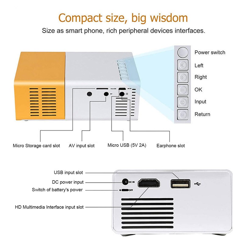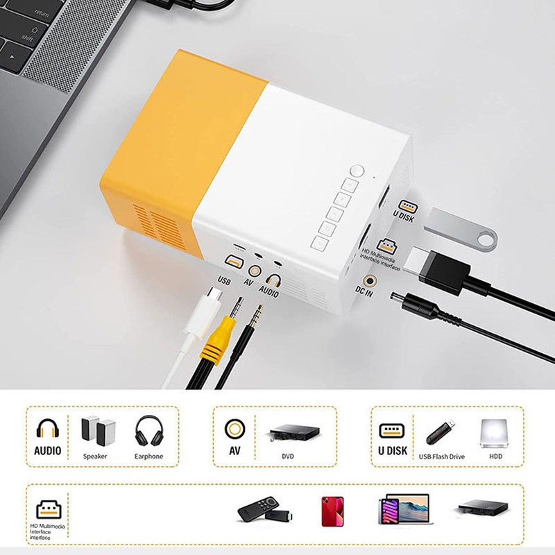 3. Multi-port: equipped with various ports such as USB, HD multimedia interface, AV, memory card, sound. This film projector can be easily connected to your smartphone, TV stick or tablet, laptop to play videos, TV shows, live sports, games and more.
