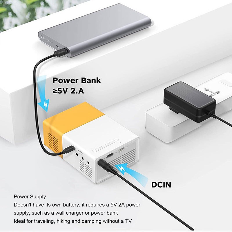 • Power supply: the small projector does not have its own battery, it requires a 5V 2A power source such as a wall charger or a power supply. Ideal for travel, hiking and camping where there is no TV. Also very popular with children.