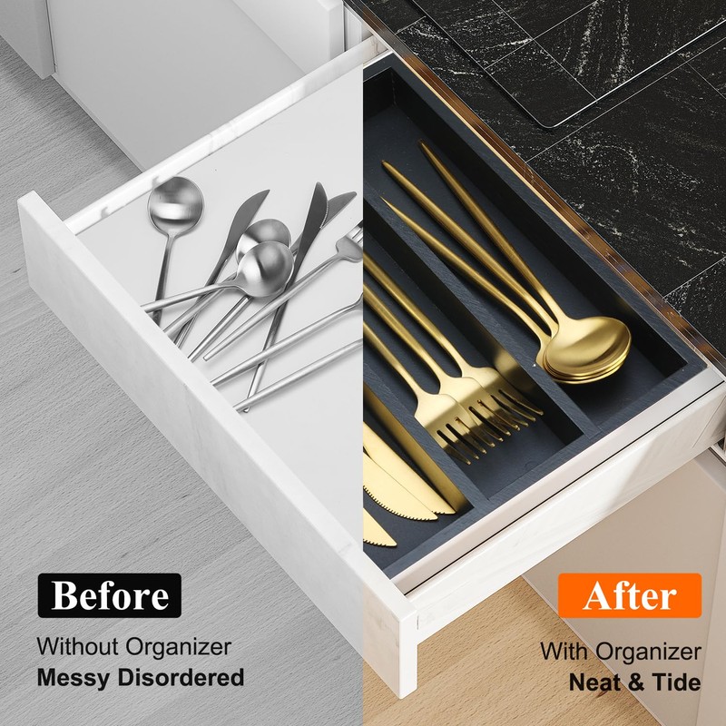 - KEEP EVERYTHING ORGANIZED: The utensil storage drawer has 3 deep compartments for your eating spoons, knives, and dinner forks to each have their own space. The cutlery drawer organizer would be a game-changer in keeping your kitchen drawers neat and organized.
