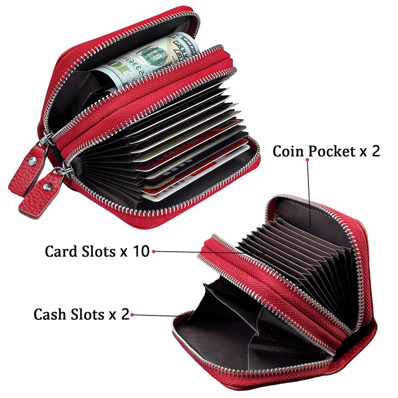 - Zip-around and Accordion design - - - This credit card organizer offers a secure, convenient way to keep your cards and cash organized. the safe credit card holder features a zipper closure for added security, plus accordion-style slots that allow you to sort and store your cards neatly. The large U-shaped opening makes it easy to find what you need quickly, while the slim, lightweight design makes it easy to slip into a pocket or bag. It's the perfect choice for the busy person who needs to stay organized while on the go.