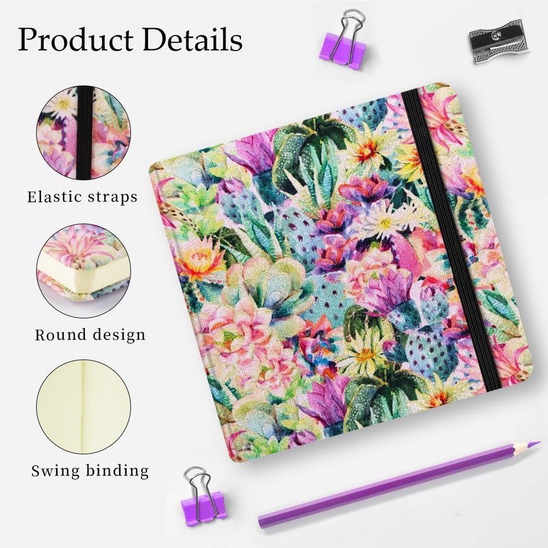 Small Square 5x5" 80gsm Mini Notebooks Blank Pages Sketchbooks Travel Journal Pocket Hardcover Paint Writing Notebook Blank Diary Memo Planner Sketchbook Fabric Cover, Cactus Flower