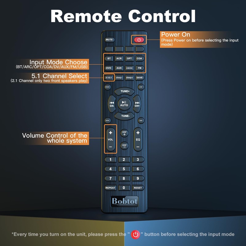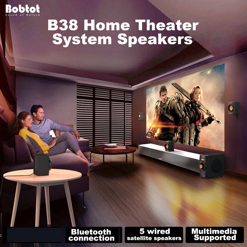 - EASY TO CONNECT AND SET UP Step 1: Wired Connection - 5 small speakers with built-in cables are wired to connect to the "AUDIO OUTPUT" slots of the Subwoofer. (NOT wireless). Step 2: Test the System to Make Sure it Set Up Properly - Turn on the subwoofer which is under the power supply, and test the remote control and Bluetooth connection (Connect Bluetooth named "Bobtot B38" on "BT" mode) to ensure everything is working properly.