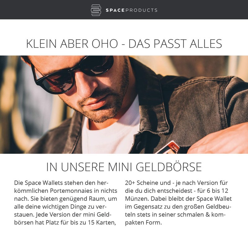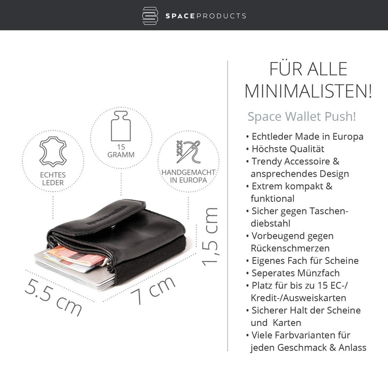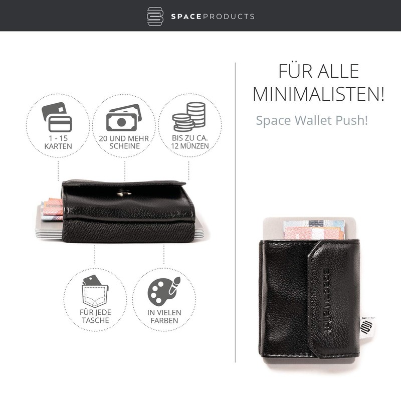 - STYLE: The Push is the innovation of Space Products. Finally a full-fledged coin compartment despite a mini wallet. Choose the colours according to your taste.