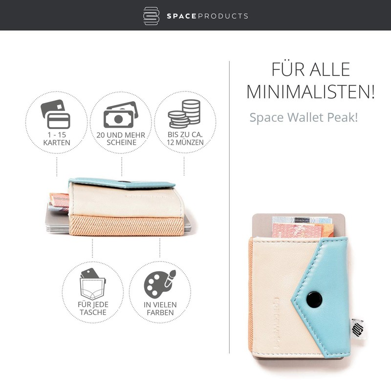 Whether as a party wallet or travel purse: your new mini wallet Space Wallet Peak fits in any tight trouser and skirt pocket, almost invisible. It is also a pleasant companion during sports. Of course, the mini wallet is also ideal as a full-fledged small wallet for the minimalists among us. Many of our customers swear by it! Unlike the Space Wallet Push, the PEAK models have a coin compartment flap in a different colour than the rest of the leather.