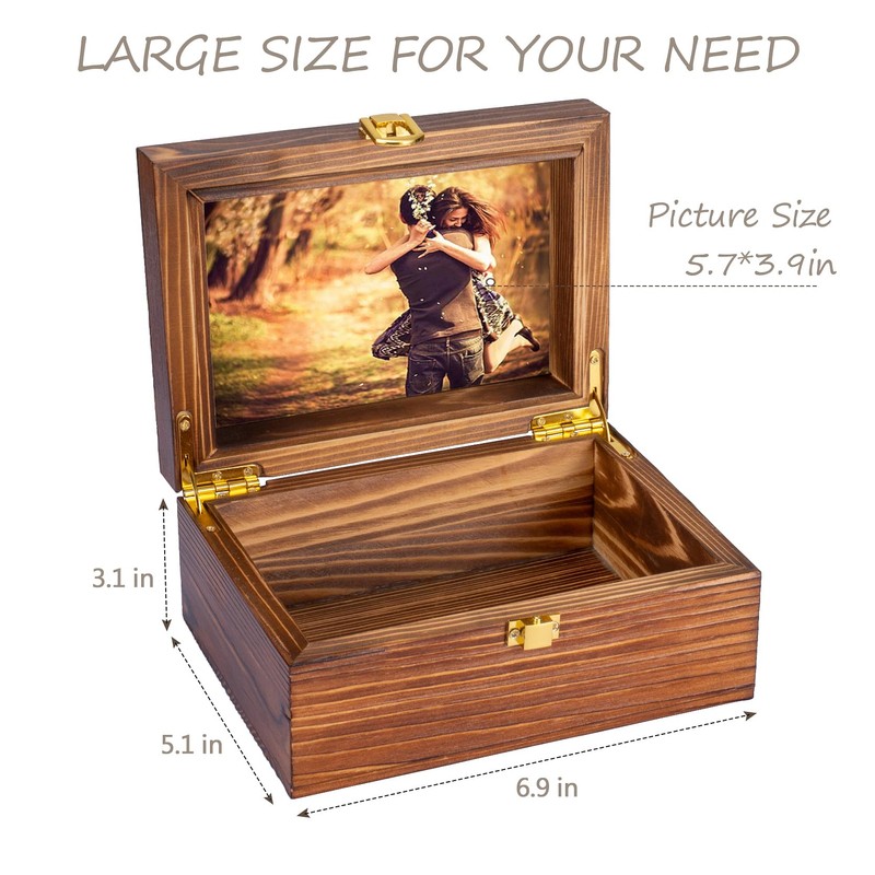 Small Wooden Memory Keepsake Boxes With Hinged Lids and a photo frame inside the lid - Decorative Storage Box With a Hinge Lids For Picture Letter Time Capsule - Wooden Gift Boxes,3.1“*5.1”*7.1“ Carbo
