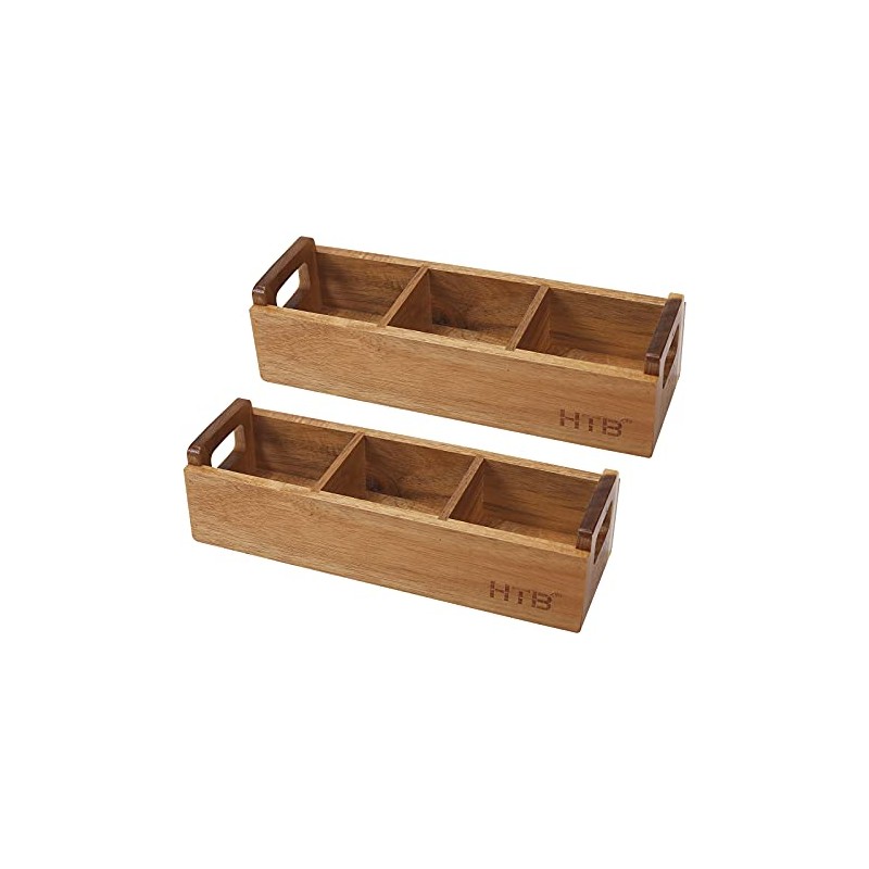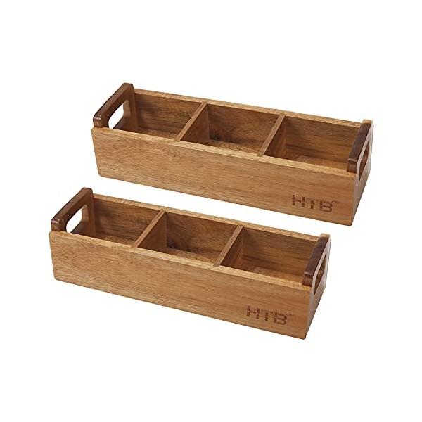 Small Wooden Tea Bag Box 2PCS by HTB, 3 Compartments Acacia Wood Tea Bag Chest with Handle, Mini Countertop Divided Storage Container for Beverage Supplies, Sugar, Sweeteners, Individual Packets
