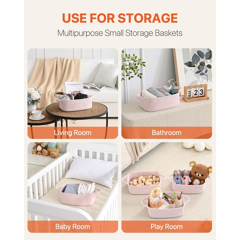 - [ Safe & Durable ] Our small woven basket is made of 100% natural cotton rope that is sturdy yet soft to touch, odor free, free of harsh chemicals, no hard edges that protect your precious furniture and flooring from scratches. So, it's a reassuring choice for families with babies and pets. We use high-quality ropes and hand-woven by skilled artisans to ensure the quality of our cotton rope baskets, tightly constructed and long-lasting