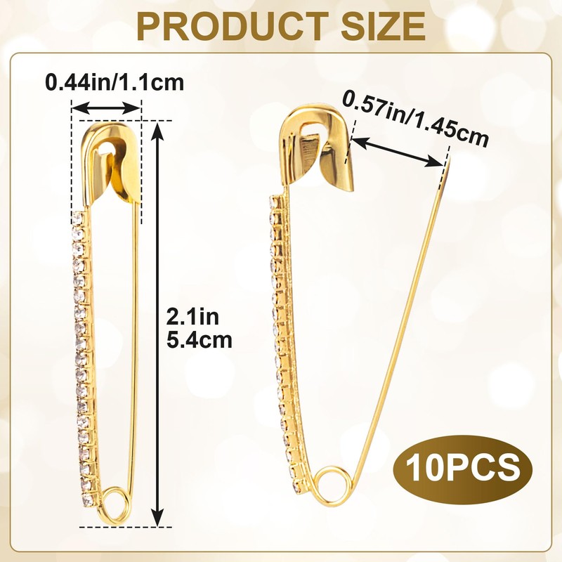 - Package Include: You will receive 10pcs gold rhinestones safety pins. Proper size is about 0.44 x 2.1 inch (1.1 x 5.4 cm). Sufficient quantity for daily use for all seasons