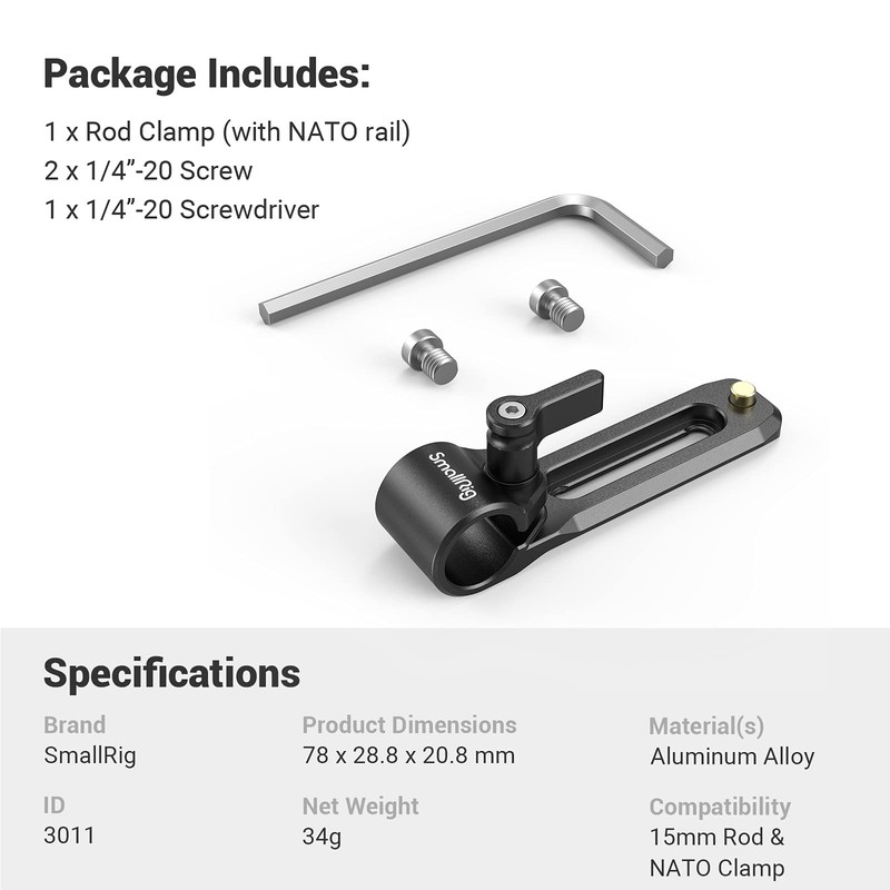 - SMALLRIG 3011 is a single 15mm rod clamp with an integrated NATO rail on the other end. Use the single 15mm rod clamp to attach a 15mm rod to your rig.