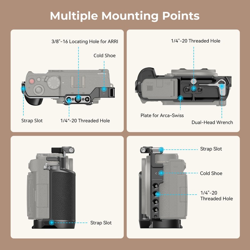 - Multiple Mounting Points: Multiple built-in mounting interfaces include 1/4"-20 holes and 3/8"-16 locating holes for ARRI to attach a top handle(ID: 3765) , Microphone (ID: 3487), Wrist Strap (ID: 3848), etc. The cage provides unobstructed access to the camera buttons, card slots, LCD screen, MCS switch, battery, etc.