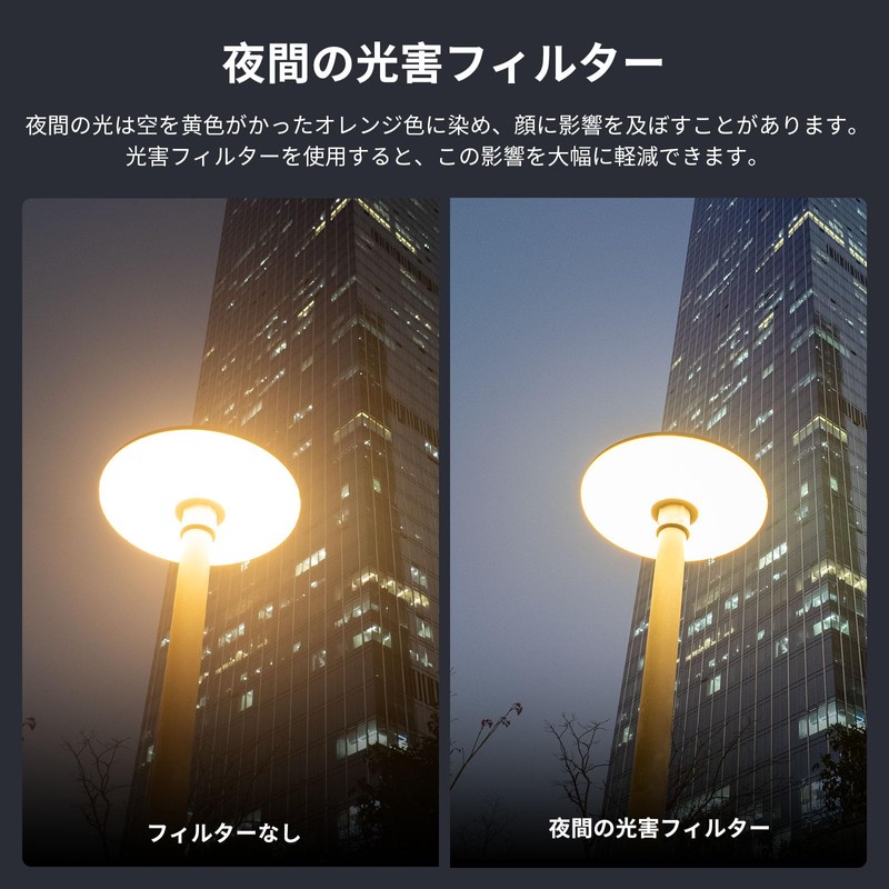 • 【夜間用光害フィルター】夜間の光は空を黄色がかったオレンジ色に染め、顔に影響を及ぼすことがあります。光害フィルターはこの影響を大幅に軽減します。都市の夜間撮影に適しています。