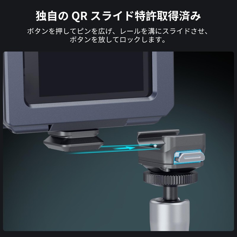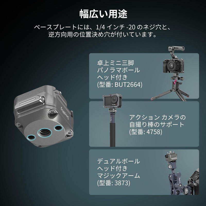 - 【複数のマウントソリューション】 ベースプレートには、1/4"-20 ネジ穴と位置決め穴があり、SmallRig ミニボールヘッドマウントサポートキット (ID: 2948B)、SmallRig ミニ三脚 (ID: BUT2429、3905) などの 1/4"-20 ネジ付きアクセサリ、およびマジックアーム (ID: 3873、3874、3875、3959、4194) や SmallRig HawkLock ケージ (ID: 4481) などの位置決めピン付きアクセサリを取り付けることができます。