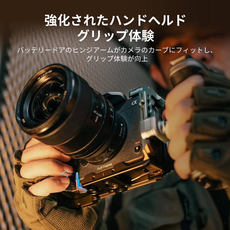 3. Battery door hinged arm fits the camera curve and improves the grip experience