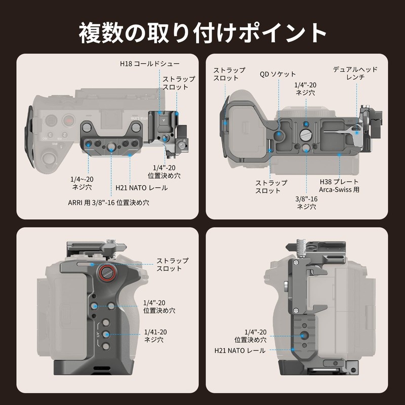 5. Multiple mounting points: 1/4"-20 threaded hole, 3/8"-16 positioning holes (for ARRI), cold shoe mount, nato rail, QD socket support handle, microphone, LED light, monitor etc.