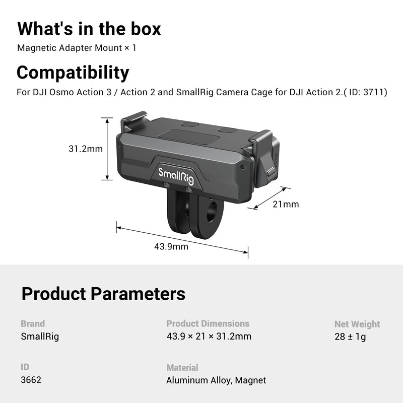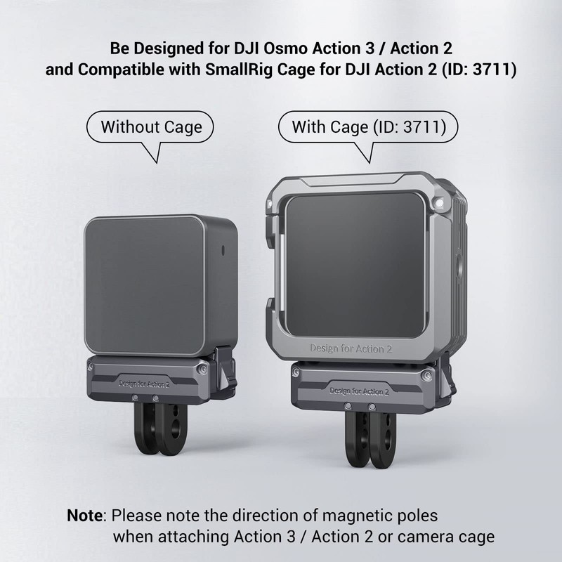 - 【Mounts via Magnets】The mount 3662 snaps onto the Action 3 / Action 2 or SmallRig aluminum camera cage 3711 for DJI Action 3 / Action 2 using internal magnets, allowing you to quickly mount or remove the camera at any time.