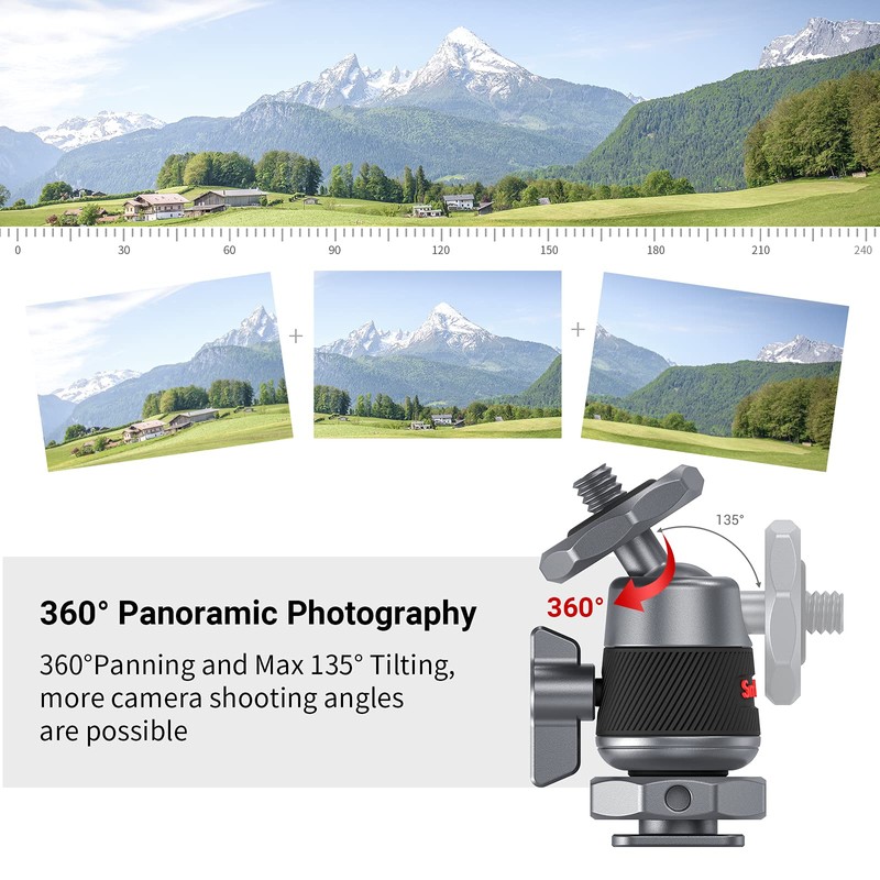 • 360-Degree Rotating Head: The camera ball head ensures 360-degree horizontal and 135-degree tilting rotation. The knob could be used to adjust the ball head to any angle.