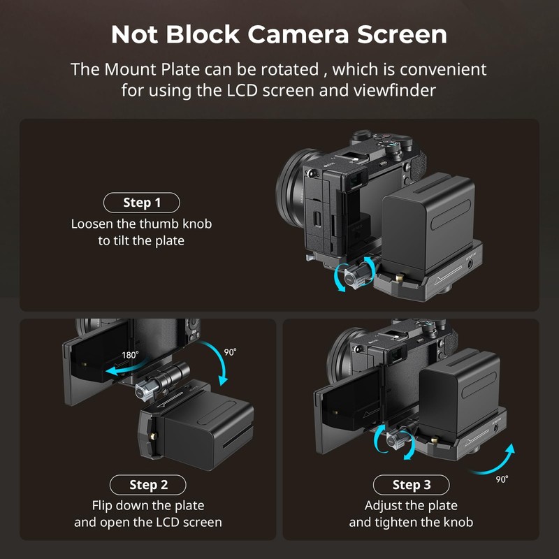 - Easy Access & Quick Adjustments: The mount features a rotatable design that ensures easy access to your camera's LCD screen and viewfinder. Additionally, the pivot position uses a damping mechanism to prevent sudden equipment drops, safeguarding your gear. The tool-free adjustment and locking parts make it fast and easy to set up or reposition, saving valuable time on set. Note: When used for Canon EOS R5C, the Mount Plate cannot be used in a vertical (90°) position.