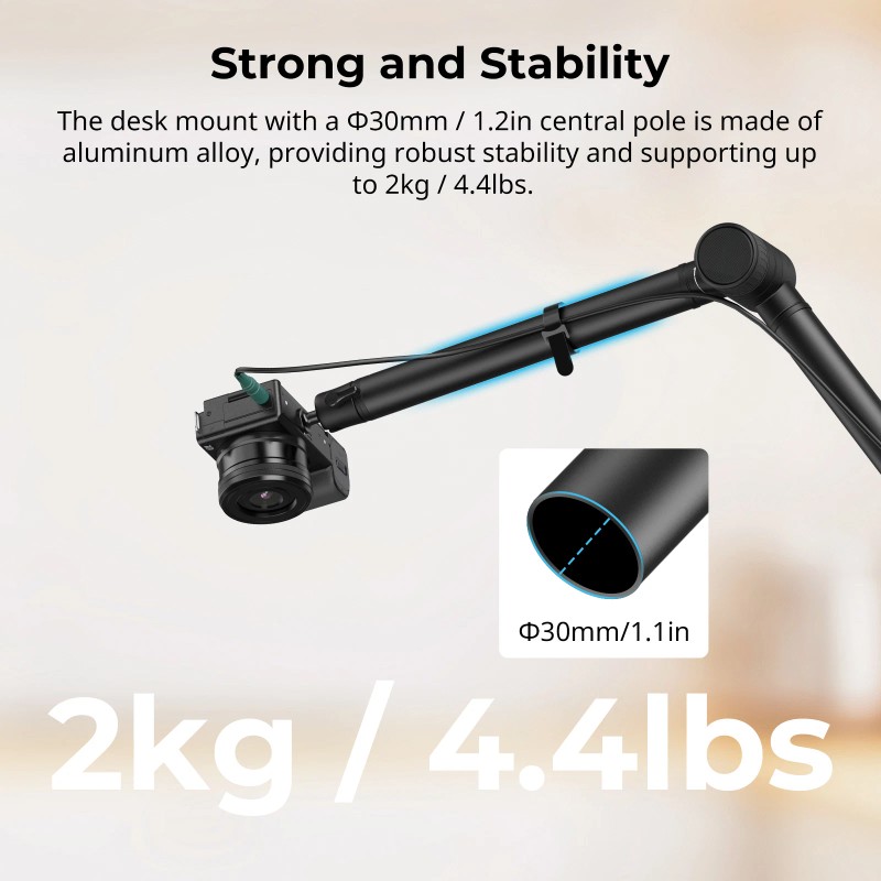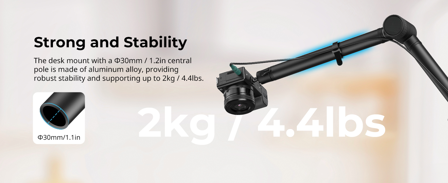 - Sturdy Aluminum Alloy: The desk mount with a ⌀30mm / 1.2in central pole is made of aluminum alloy, which providing robust stability and maxium load up to 2kg / 4.4lbs, supporting to connect devices such as phones, mirrorless cameras, and webcams.