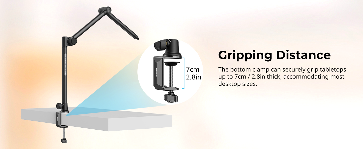 - Tabletop Clamp Distance: The bottom clamp of this camera desk mount can securely grip tabletops up to 7cm / 2.8in thick, accommodating most desktop sizes.