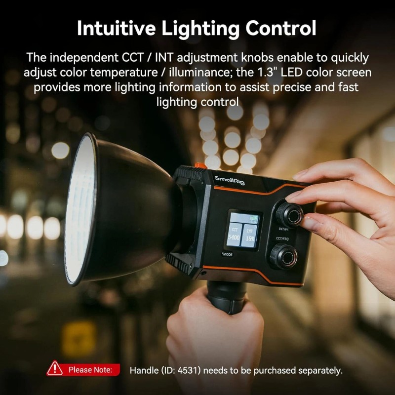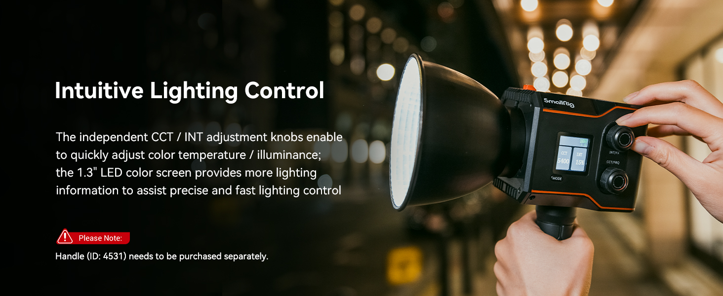 - Simple & Precise Light Control: There is an independent CCT/INT adjustment knob on the side of the light body, which can quickly adjust the color temperature and illumination, with simple operation and timely feedback. The 1.3" LED color screen provides richer lighting information, allowing you to accurately control lighting parameters and find the light that is most suitable for the shooting scene.