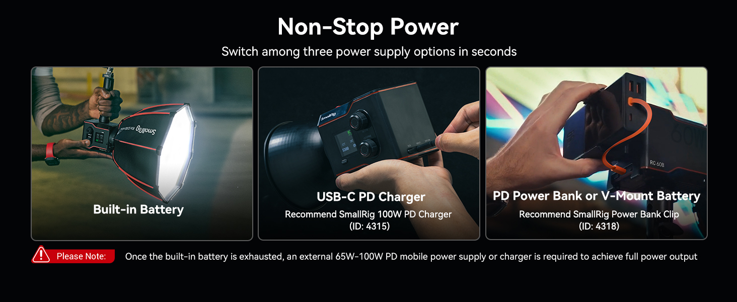 - Type-C PD Fast Charging: The LED video light has a Type-C interface that supports up to 100W PD fast charging (compatible with PD power banks and PD adapters with an output power of 65W and above). It supports mainstream fast charging/power supply protocols and can be used while charging. NOTE: SMALLRIG 100W PD Charger for RC 60B - 4315/4370/4371/4372 needs to be purchased separately.