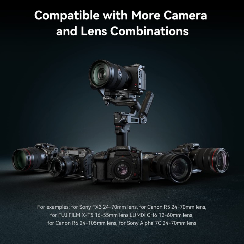 - Wide Compatibility This mount clamp is designed to support various cameras, e.g. For Sony FX3 with 24-70 mm lens, for Canon R5 with 24 70 mm lens, for FUJIFILM X-T5 with 16-55 mm lens and GH6 with 12-60 mm lens.