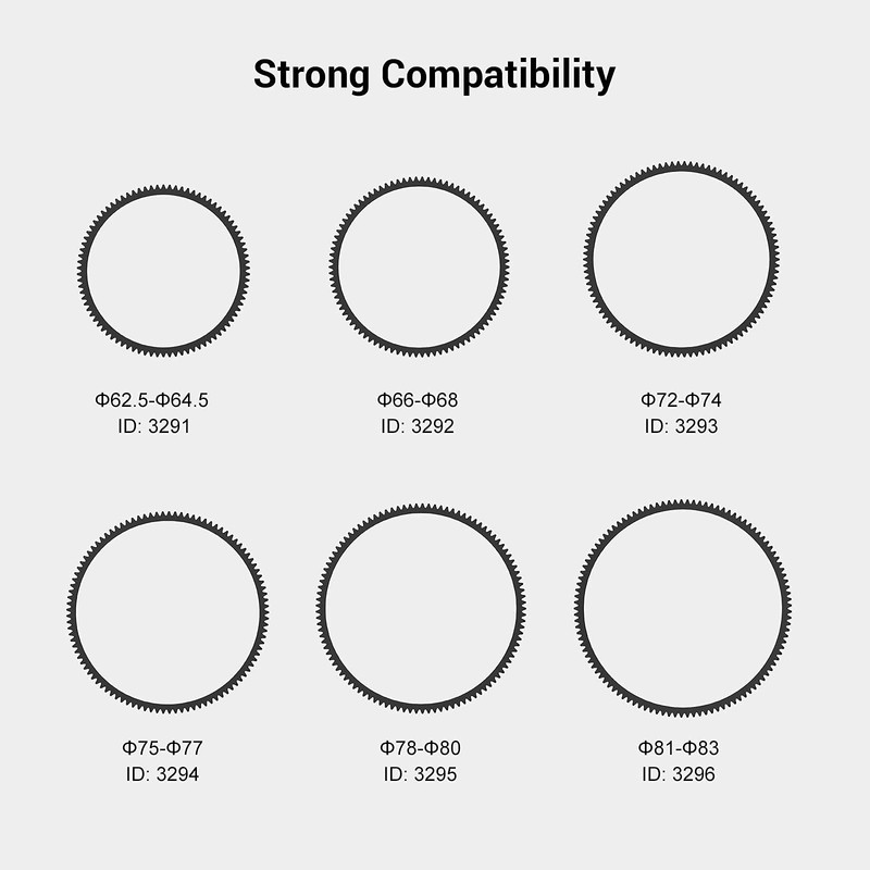 • RELATED ACCESSORIES The ring 3292 can work with other follow focus systems, such as the Seamless Focus Gear Ring 62.5 to 64.5 mm 3291, 72 to 74 mm 3293, 75 to 77 mm 3294, 78 to 80 mm 3295, 81 to 83 mm 83 296