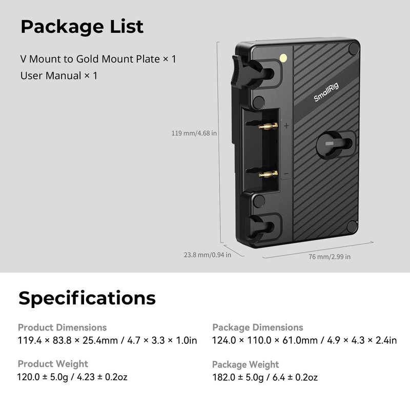 1. The plate features a standard Gold Mount on the front and a standard V Mount on the back, ensuring universally compatible with various models of Gold Mount and V Mount batteries. It can be used to convert G-mount batteries to V-mount.