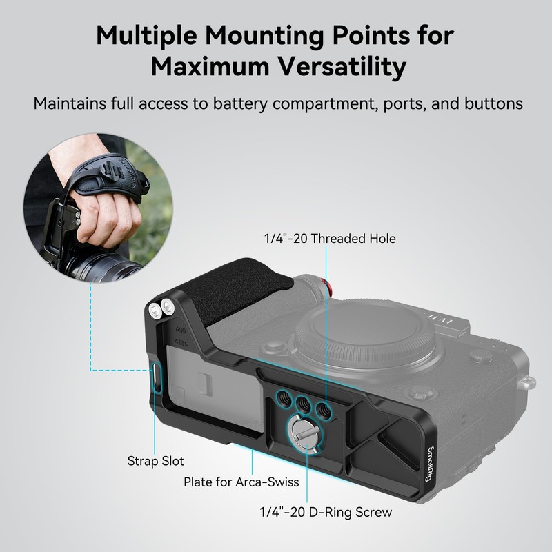 SmallRig L-Shape Grip for FUJIFILM X-T5 (Black) 4260 is designed to improve your grip on the camera. With the same texture and color, it matches for FUJIFILM X-T5 perfectly. The grip easily locks the camera via a mere 1/4"-20 D-ring thumbscrew at the bottom, where multiple accessory mounts are included too. They include an quick-release plate for Arca-Swiss tripods, three 1/4"-20 holes for tripods or for Manfrotto-type plates, and a strap slot for Hand Strap 3848. The grip features a slim and compact baseplate that weighs only 79g. It also comes with a shutter button to enhance touch.