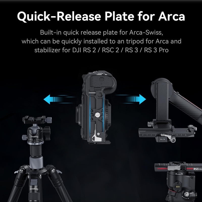 - Quick Switch: The quick-release plate for Arca-Swiss at the bottom, can be quickly installed to the tripod for Arca and stabilizer for DJI RS 2 / RSC 2 / RS 3 / RS 3 Pro, for a quick switch between gimbal and tripod shooting. The built-in magnetic wrench at the bottom is convenient for disassembly and assembly.