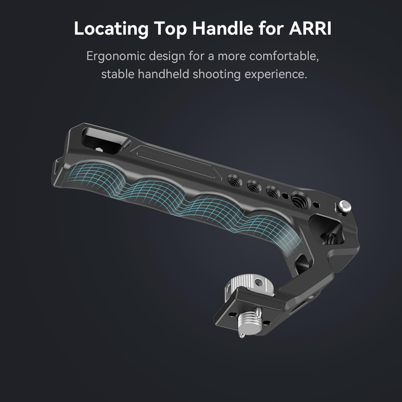 - Ergonomic Top Handle: The top handle feels comfortable and enables easy carrying and low-angle shots. 1/4"-20 threaded holes, 3/8"-16 locating holes for ARRI, cold shoes, and NATO rails support monitor mount 2905B/2903B, microphone 3468, LED light 3286, NATO accessories.