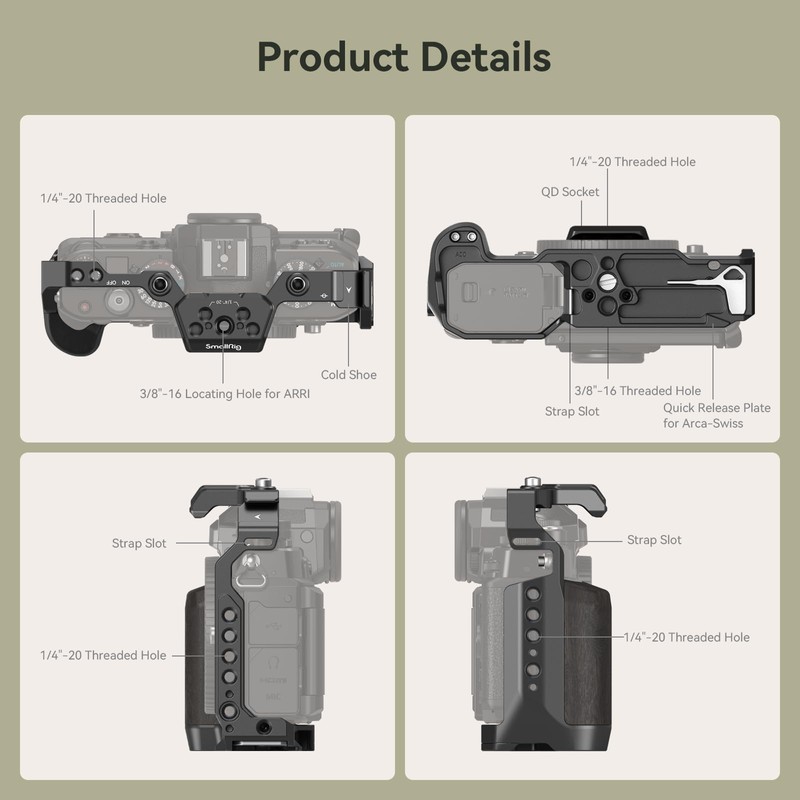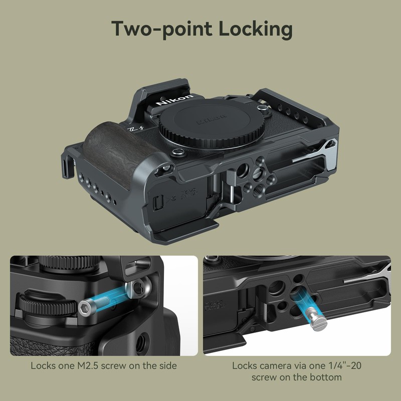 - All-Round Protection - It securely locks the camera via a 1/4"-20 screw on the bottom and an M2.5 screw on the right side, while also featuring rubber pads to prevent scratches, and maintains full access to all the camera's buttons, card slots, flip screen, and battery door.