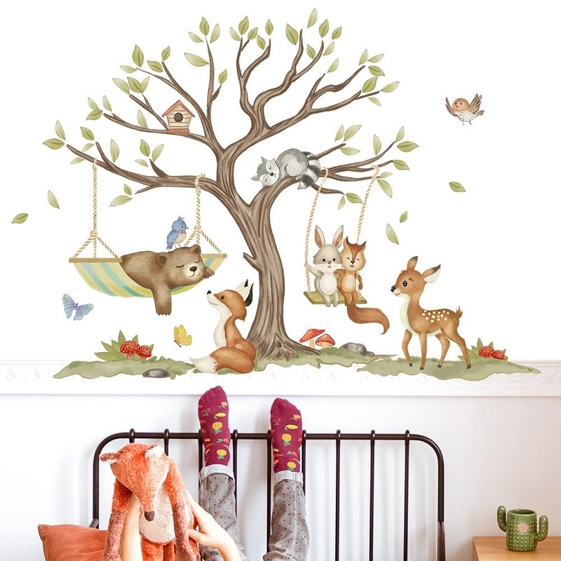 SMAOSTORE Large Tree Wall Sticker Stylish Bear Fox Swing Kids Room Bedroom Bedroom Kindergarten Classroom Background Wall Waterproof Removable Wall Paper Wallpaper Sticker