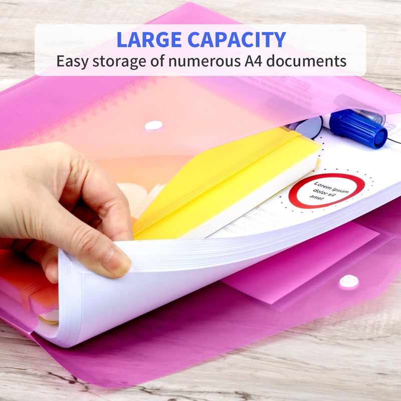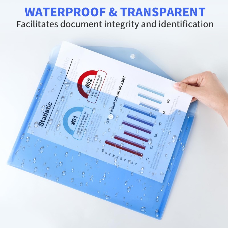 • Practical Design The opening and closing of the plastic folder is designed with sturdy buttons to prevent files from falling out, making them easy to access when working or travelling. The transparent design allows you to easily identify the contents of the document bag and easy to find what you want