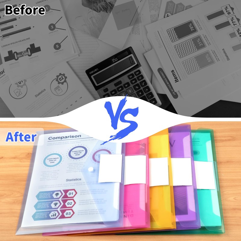 • Organized: The folders offer you a choice of 5 colours, making it easy to sort the contents of the bags by colour. Also comes with labels to categorize your files more efficiently. The A4 plastic sleeves are perfectly tailored to your needs for storing and categorizing your files