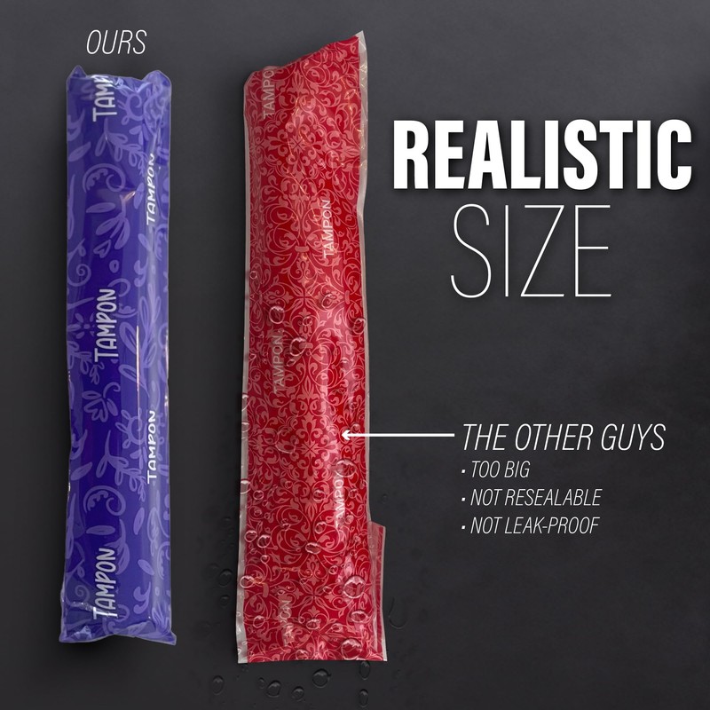- EACH PACKAGE INCLUDES: 5 pieces of 1 oz (30 ml) fake tampon flasks with 5 reusable wrappers. The wrappers have an adhesive that is resealable, so you can keep using them.