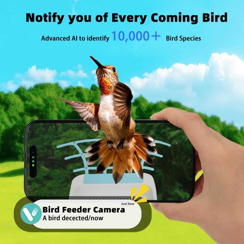 • 🐦【Real-time notification & smart detection for birds】Auto-capture and instant notification for every bird at your feeder. This smart bird feeder with camera detects object in 0.5s and send instant notification on App, with advanced AI to identify 10000+ wild bird spices, including cardinals, blue birds, hummingbirds, starlings and more! Say goodbye to traditional binoculars and experience birdwatching up close without disturbing the birds via hummingbird feeder with camera.