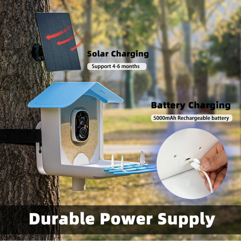 • 🔋【Long-Lasting Solar Charging, Eco-Friendly and Durable】 This smart bird feeder with camera has a built-in 5000mAh rechargeable battery and a 3W solar panel for constant charging, ensures long-lasting power - up to 6 months when fully charged! With an external antenna and 2.4GHz WiFi connection, you no longer have to worry about signal loss.