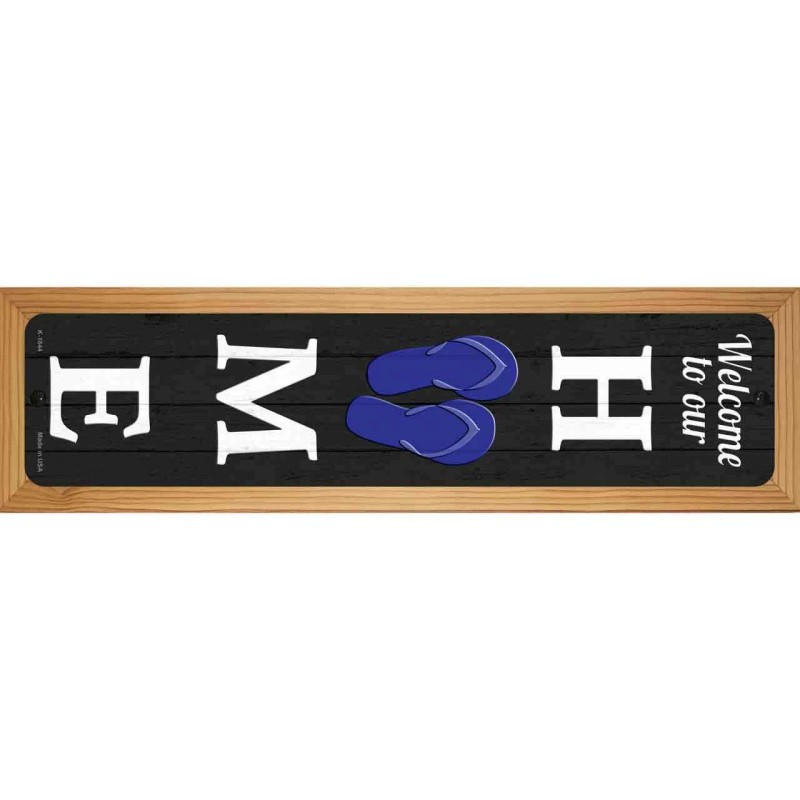 Home Flip Flops Novelty Wood Mounted Small Metal Street Sign. 4" x 18" aluminum metal small street sign mounted on a handcrafted wood border frame. This item is easy to hang with a nail or add a rope to give it a personal touch. This item will be shipped out within 24-48 hours of the order being placed. Our wood bordered frame is assembled with an elegant stained finish to highlight the selected plate in the middle. With over 1000 different signs to choose, there is bound to be one for you. This item is always be in stock and will not have to be backordered. Our products are proudly made in the U.S.A.